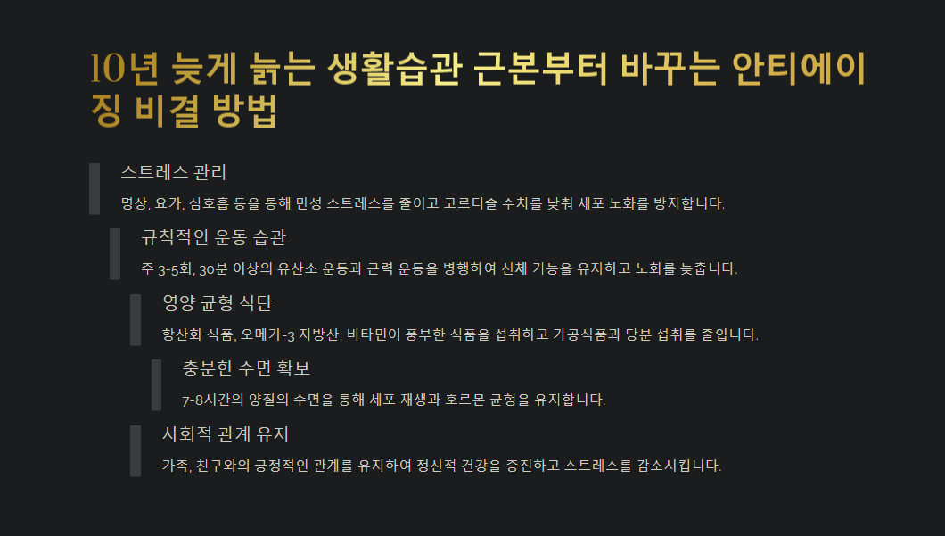 특히 장수호르몬 분비를 촉진하는 운동 습관, 심리 안정, 항산화 식품 섭취, 적절한 수면이 하나로 어우러질 때, 비로소 10년 뒤의 모습이 크게 달라질 수 있습니다. 건강 수명까지 고려한다면, 그 가치가 더욱 빛날 것입니다.