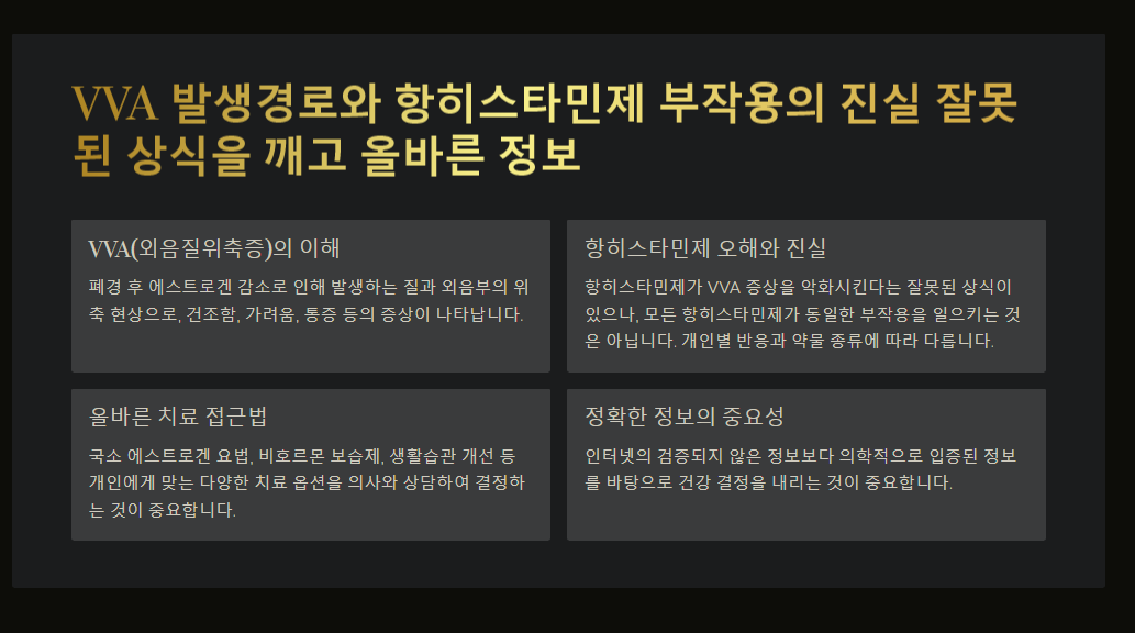 또한, 인터넷 상에 퍼져있는 정보 중 다수는 단순히 호르몬 감소만을 원인으로 설명하고 있으나, 항히스타민제와 같은 약물 부작용이 VVA 증상에 미치는 영향에 대한 언급은 드물어, 이 부분에 대해 보다 심도 있는 논의가 필요합니다.
